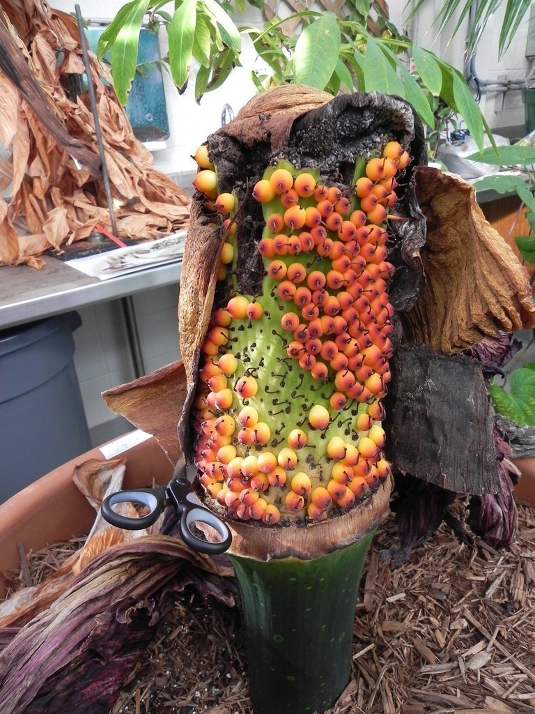 Self-pollination is normally considered impossible, but in 1999, Huntington Botanical Garden botanists hand-pollinated their plant with its own pollen from ground-up male flowers. The procedure was successful, resulting in fruit and ten fertile seeds from which several seedlings eventually were produced.[16] Additionally, a titan arum at Gustavus Adolphus College unexpectedly produced viable seed through self-pollination in 2011.