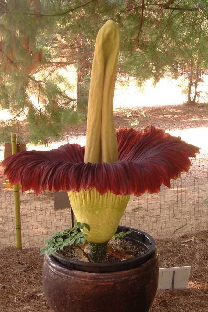 The corm is the largest known, typically weighing around 50 kilograms (110 lb). When a specimen at the Princess of Wales Conservatory, Kew Gardens, was repotted after its dormant period, the weight was recorded as 91 kilograms (201 lb).[3] In 2006, a corm in the Botanical Garden of Bonn, Germany was recorded at 117 kilograms (258 lb),[4] but the present record is 305 lbs (138.6 kg) for an A. titanum grown in Gilford, New Hampshire by Dr. Louis Ricciardiello in 2010.